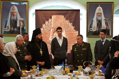 Открытие выставки «Духовный щит Отечества» в Московской духовной академии в Сергиевом Посаде, 2011 год. На фото проректор московской духовной академии игумен Вассиан (Змеев), руководители фонда Омофор- генерал-полковник Баранов В.П., контр-адмирал Бражник А.И., генерал-майор Черкасов А.В. и директор Обстройтех Фирсов В.В.