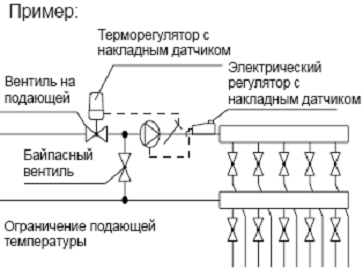 набор применяется для регулирования подающей температуры в системах напольного отопления, например, прикомбинированном радиаторе и напольном отоплении. На терморегуляторе выставляется желаемая подающая температура. Электрический регулятор выключает циркуляционный насос как только настроенное значение будет превышено в результате каких либо помех. Байпасный вентиль служит для регулирования пропуска теплоносителя по контуру напольного отопления |